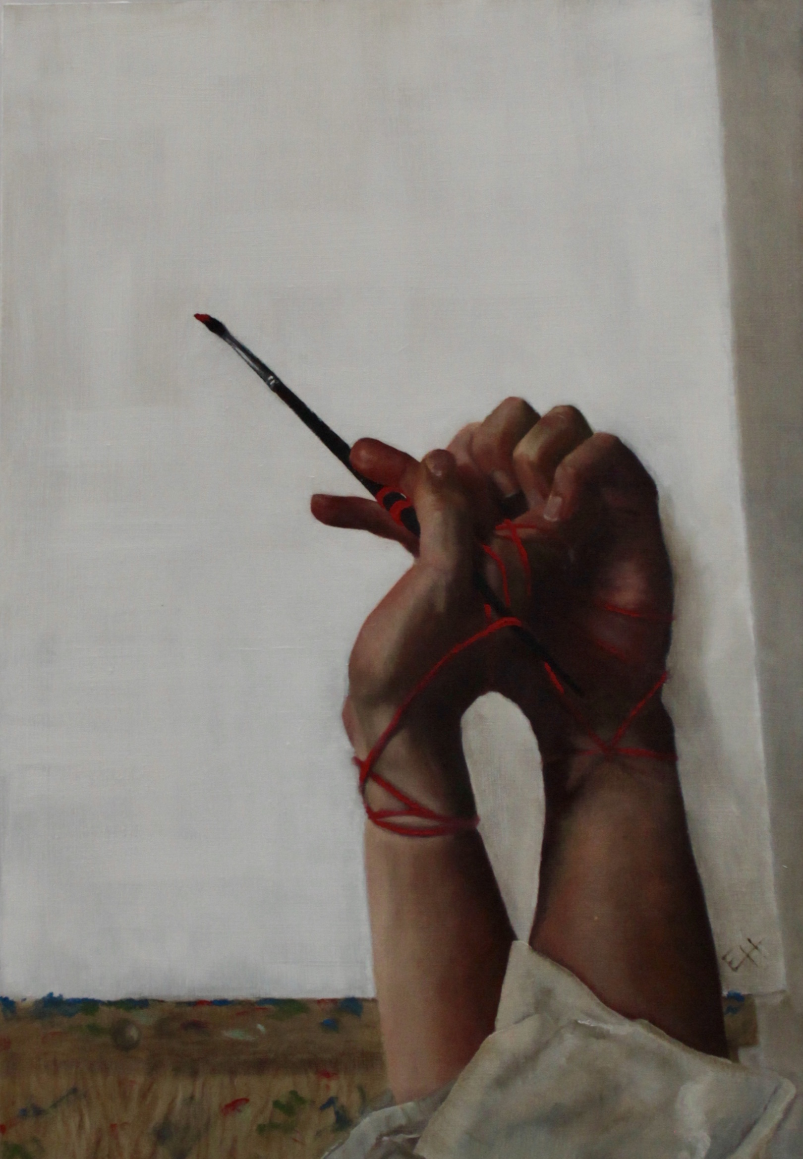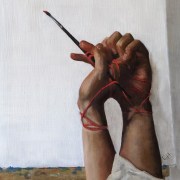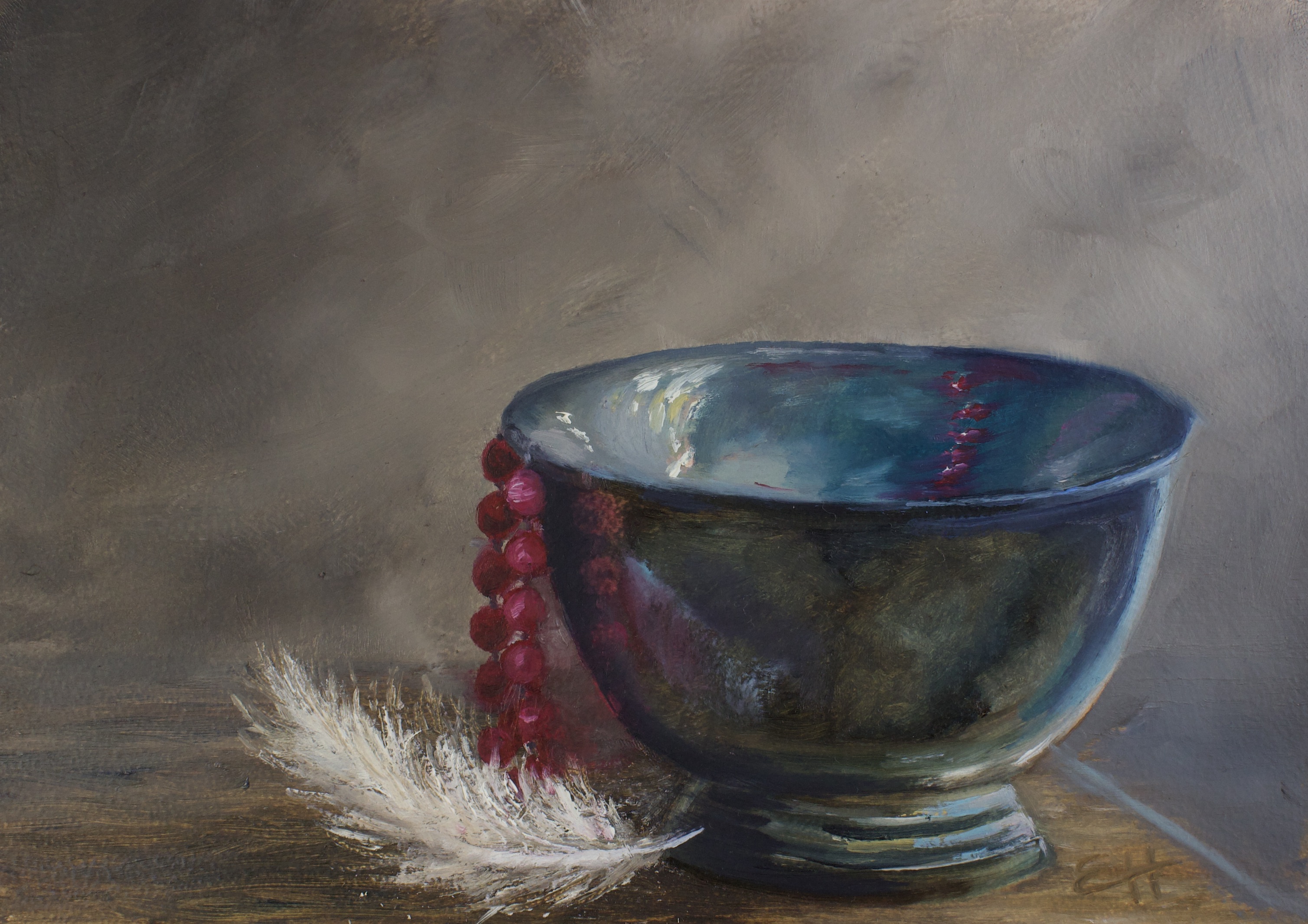 This trompe l’oeil painting of a feather hanging from a painted cedar plank was painted on a fine-weave Alcot panel. I fought with laying down paint and building up texture without picking up wet paint from the previous layer.